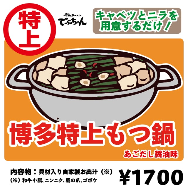 博多ラーメンでぶちゃんのおつまみメニューでも大人気のもつ鍋の麺無し単体販売。